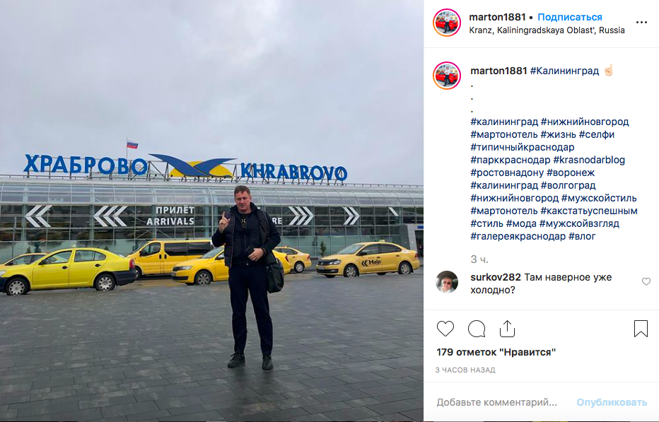 Если считать, что именно Марченко любимый Волочковой, то сегодня он отправился по делам в Калининград. В своем Инстаграме мужчина опубликовал фото из местного аэропорта Храброво.