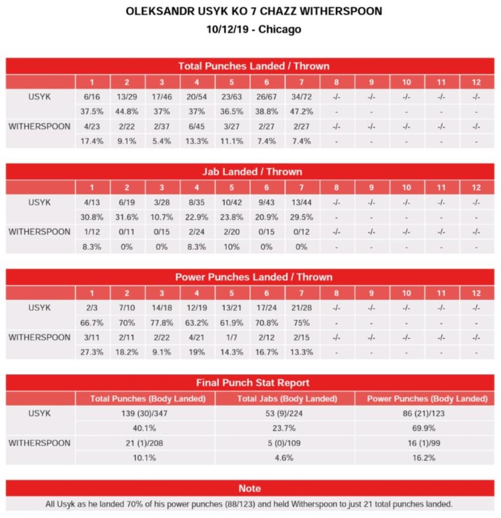 Боксерский поединок между украинцем Александром Усиком и Чаззом Уизерспуном завершился досрочной победой первого. Согласно статистике ударов портала CompuBox, украинец нанес большее количество точный ударов, чем его соперник.