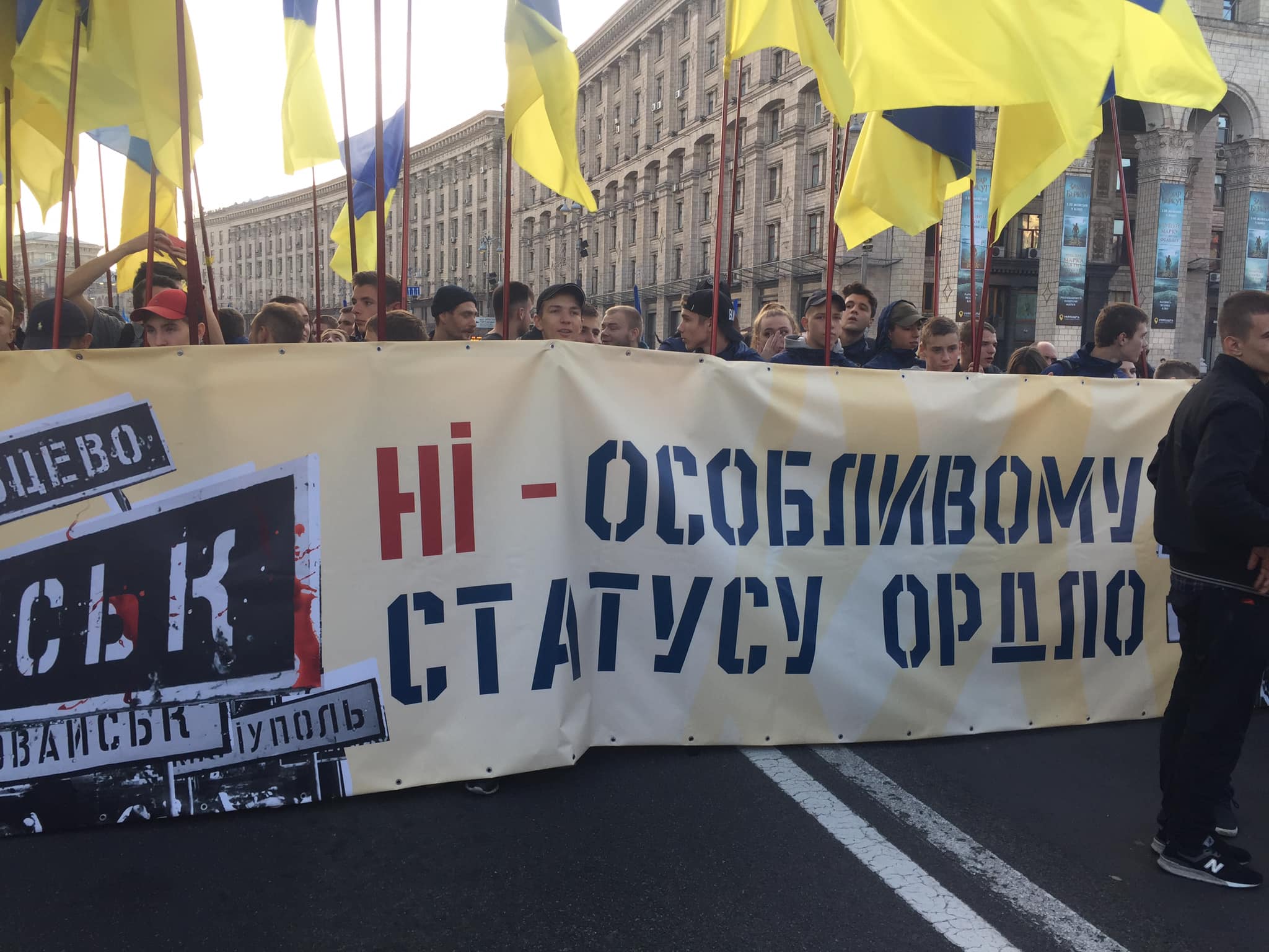 Видны флаги Правого сектора, Нацкорпуса. Колону возглавляют ветераны АТО с плакатом "Нет капитуляции".