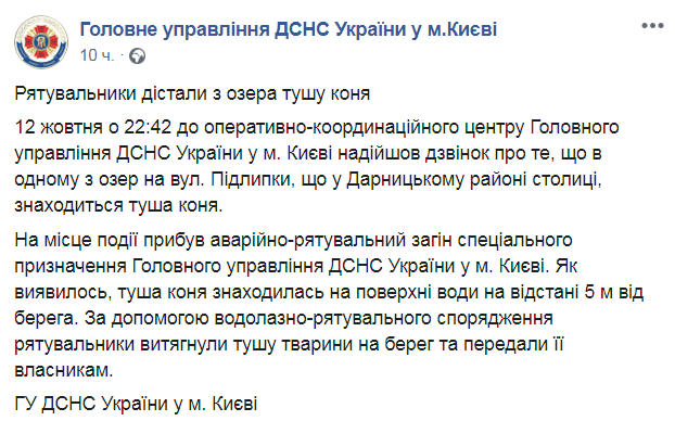 12 октября в 22:42 в оперативно-координационный центр Главного управления ГСЧС в Киеве поступил звонок о том, что в одном из озер в Дарницком районе столицы плавает туша коня.