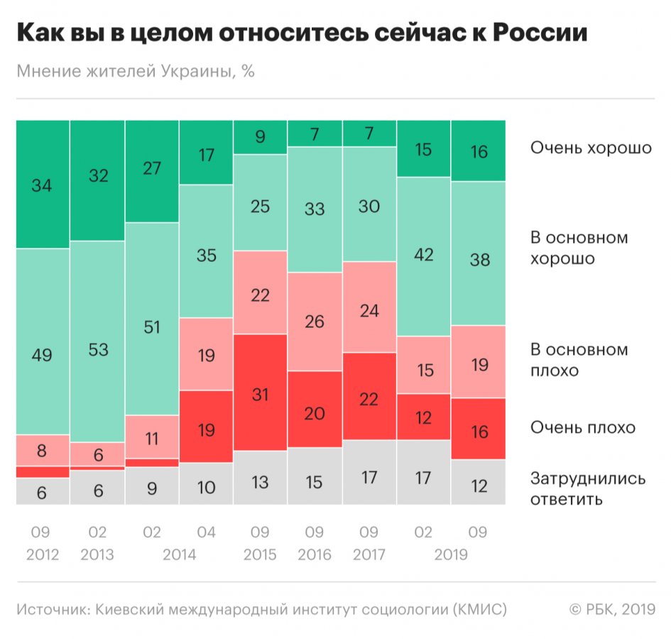Отношение жителей Украины к России от февраля к сентябрю 2019 года существенно не изменилось. Если в феврале 2019 года хорошо к России относились 57% украинцев (15% очень хорошо и 42% в основном хорошо), то в сентябре - 54% (16% очень хорошо и 38% в основном хорошо).