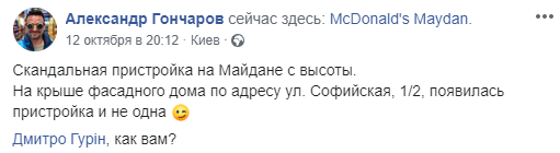 В комментариях к посту Бахматов написал, что незаконную надстройку на крыше жилого дома, в котором расположен ресторан McDonalds и который смотрит на Майдан Независимости, снесут.