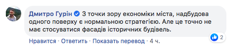 Дмитрий Гурин отозвался в комментариях под постом. "С точки зрения экономики города, надстройка одного этажа является нормальной стратегией. Но это точно не должно касаться фасадов исторических зданий" - написал он.