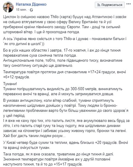 "Циклон со смешным названием Thilo бушует над Атлантикой и совсем не смешно будет втягивать в свою сферу Великобританию и все прибрежные страны северо-запада Европы. Там - дожди и сильный штормовой ветер. И еще прохладная погода. А вот Украина явно смеется над таким Thilo..." - написала Наталья Диденко.