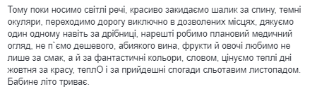 "Поэтому пока носим светлые вещи, красиво забрасываем шарфик за спину, темные очки, переходим дорогу только в разрешенных местах, благодарим друг друга даже по мелочам, наконец делаем плановый медицинский осмотр, не пьем дешевого, какого угодно вина, фрукты и овощи любим не только за вкус, но и за фантастические цвета, словом, ценим теплые дни октября за красоту, тепло и по грядущие воспоминания слякотным ноябрем. Бабье лето продолжается", - подытожила Диденко.