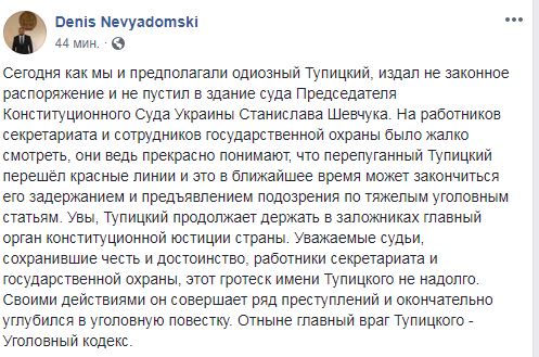 "На работников секретариата и сотрудников государственной охраны было жалко смотреть, они ведь прекрасно понимают, что перепуганный Тупицкий (Александр Тупицкий - судья, назначенный в сентябре 2019 года главой КСУ, - Ред.) перешёл красные линии и это в ближайшее время может закончиться его задержанием и предъявлением подозрения по тяжелым уголовным статьям", - сообщил Невядомский в Facebook.