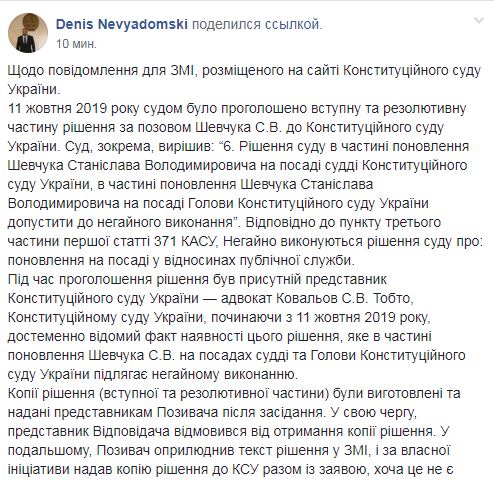 Невядомский пишет, что Конституционному суду Украины, начиная с 11 октября 2019 года, доподлинно известен факт наличия этого решения, которое в части восстановления Станислава Шевчука на должностях судьи и Председателя Конституционного суда Украины подлежит немедленному исполнению.
