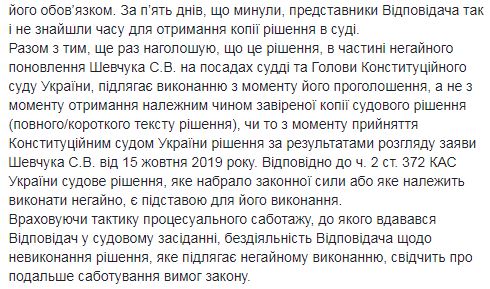 И еще раз напоминает, что решение в части немедленного восстановления Шевчука на должностях судьи и председателя Конституционного суда Украины подлежит исполнению с момента его провозглашения, а не с момента получения надлежащим образом заверенной копии судебного решения (полного/краткого текста решения), то есть с 15 октября 2019 года.