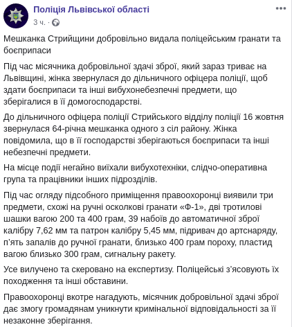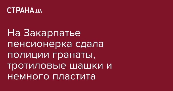 Во Львовской области 64-летняя жительница сдала в полицию арсенал оружия, среди которых были гранаты и тротиловые шашки. Об этом сообщает отдел коммуникации Главного управления Национальной полиции во Львовской области.