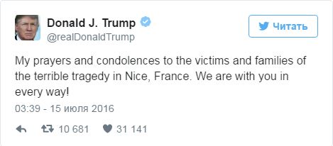 "Ужасный теракт в Ницце. Шокирован. Вместе со всем украинским народом выражаю соболезнования семьям погибших во Франции ", - написал президент Украины в Facebook.