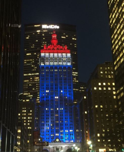 9.05 - В знак поддержки и сочувствия Франции в США многие здания были подсвечены цветами французского флага. Так сине-красно-белым стал Центральный вокзал Нью-Йорка на Манхэттене.