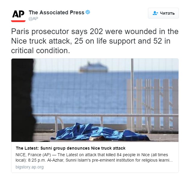 22.07 - Количество пострадавших во время теракта в Ницце на Английской набережной 14 июля выросло до 202 человек, 52 из них настоящее время находятся между жизнью и смертью, а на месте сразу погибли 84 человека. Об этом сообщает в микроблоге Twitter The Associated Press.