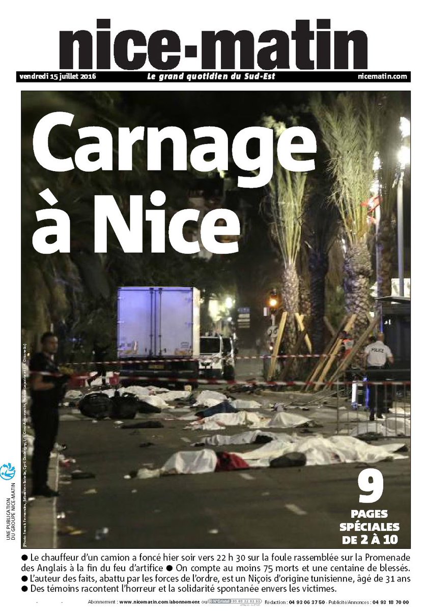10.19 - Французская пресса рассказывает о кровавых подробностях теракта. Так ежедневная французская газета Nice-Matin вышла с фото тел на передовице. "Резня в Ницце" так называется главный материал газеты, которому посвящено 9 полос издания.