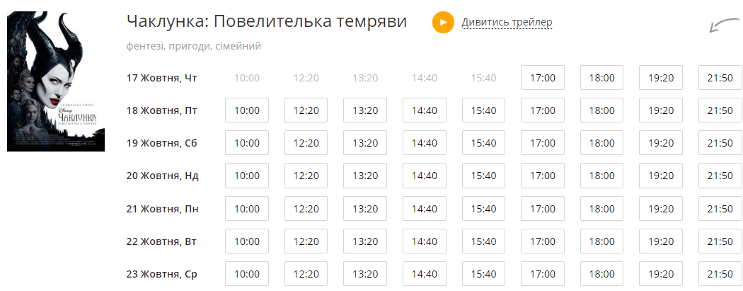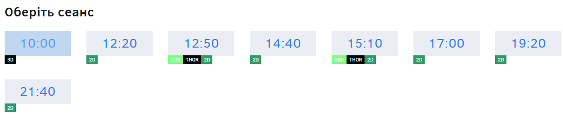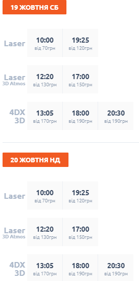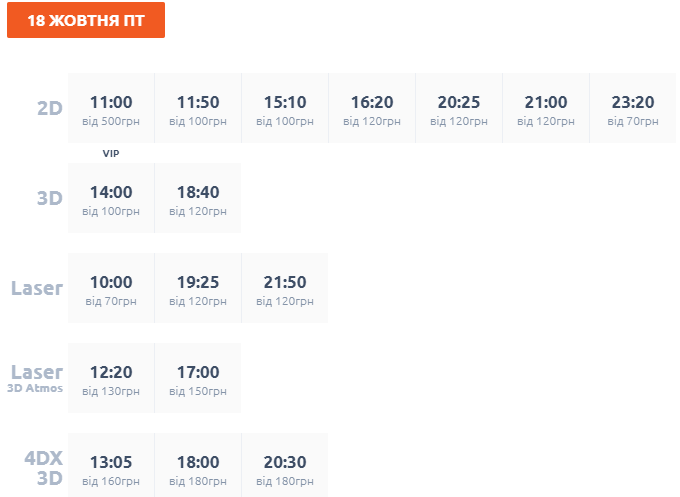 В пятницу, 18 октября, сеансы начинаются в 10:00. Стоимость билетов 70 грн; в 12:20, 12:50, 14:40, 15:10, 17:00 - билеты по 100 грн; в 19:20 и 21:40 - билеты по 180 грн.