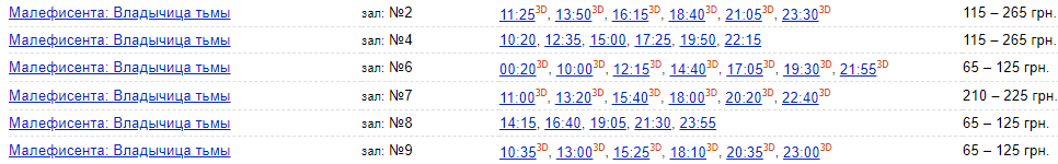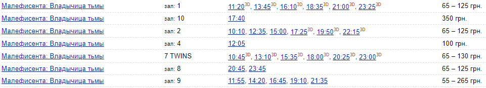 Посмотреть "Малефисенту" в ТРЦ "Океан Плаза" можно от 70 до 180 грн. Вип-зал обойдется в 500 грн за место. С 11:50 до 16:30 билеты 3D будут стоить от 100 грн. В 18:40 и 21:00 посмотреть "Малефисенту" можно будет за 120 грн. В 23:20 - билеты будут стоить 70 грн.