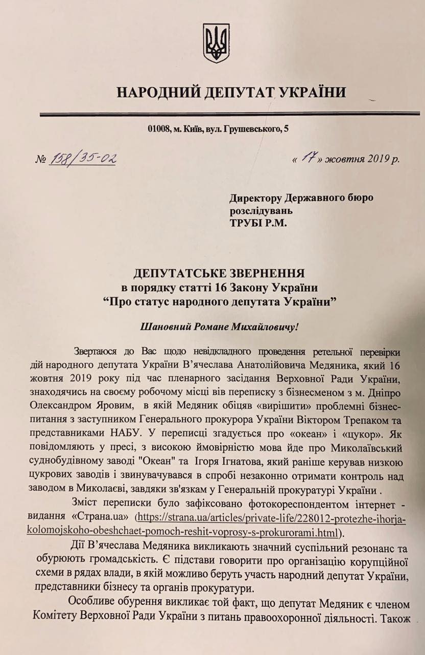 16 октября фотокорреспондент "Страны" снял странную переписку депутата Вячеслава Медяника, где он обещал контакту "Саша Яровой" помочь с решением вопросов по поводу "океана" и "сахара" и помочь решить проблемы с Генеральной прокуратурой и НАБУ, а также поговорить по поводу "сахара" с заместителем генерального прокурора Украины Виктором Трепаком.