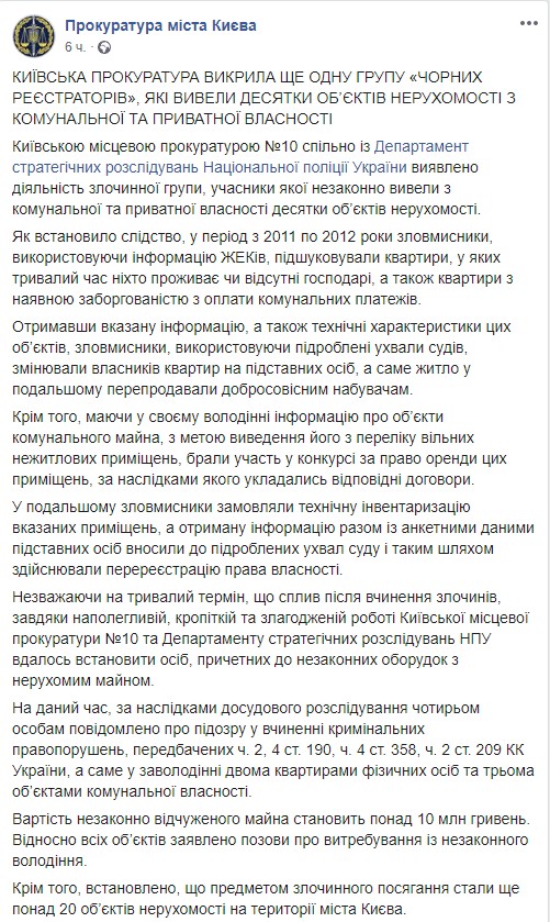 "Киевской местной прокуратурой №10 совместно с Департаментом стратегических расследований НПУ обнаружена деятельность преступной группы, участники которой незаконно вывели из коммунальной и частной собственности десятки объектов недвижимости", - говорится в сообщении.