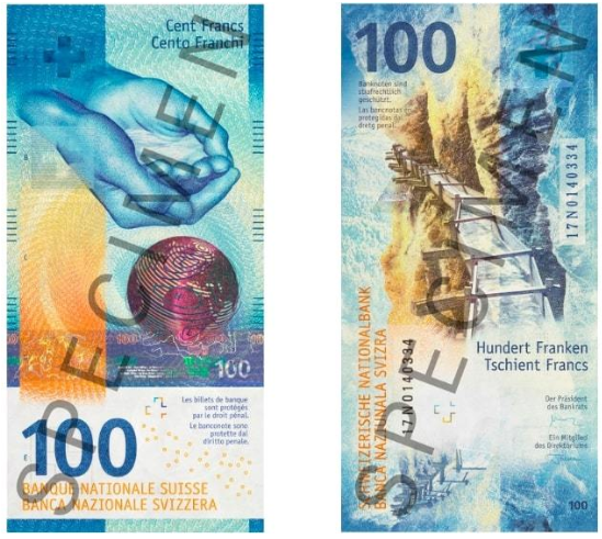 Швейцария запустила в свой денежный оборот новую банкноту 100 франков (девятой серии), сообщил Нацбанк Украины нашим финучреждениям в телеграмме №50-0006/52440. Она уже развезена по местным банкам и принимается в торгово-сервисной сети страны. Новая серия швейцарских франков имеет общий элемент - изображение рук и земного шара. Ее тема "Многогранность Швейцарии".