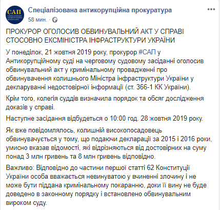 "Прокурор САП в Антикоррупционном суде на очередном заседании огласил обвинительный акт в уголовном производстве по обвинению бывшего министра инфраструктуры Украины в декларировании недостоверной информации", - говорится в сообщении.