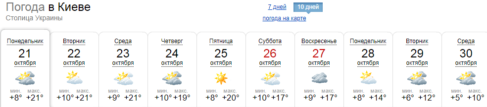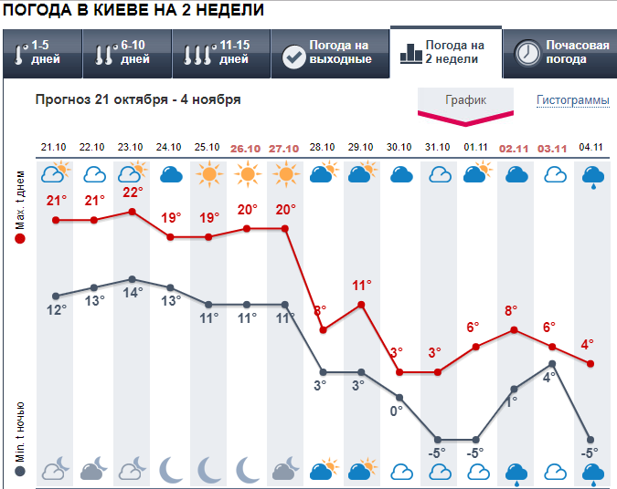 Долгосрочный прогноз погоды в Киеве на две недели от шести погодных ресурсов.