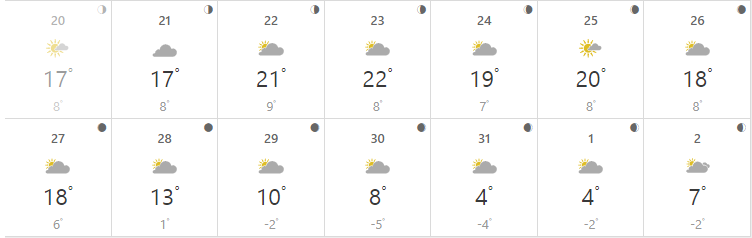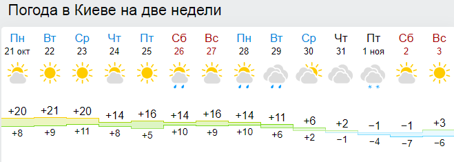 Сайт Weather.com прогнозирует переменную облачность без осадков на протяжении всей недели. Дневная температура +18...+22. С воскресенья, 27 ноября, температура начнется снижаться с +13 до +4 днем. С 29 октября ночью обещают морозы от -2 до -5.