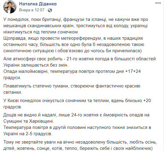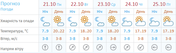 Сайт Sinoptik.ua прогнозирует теплую и сухую погоду, которая продержится до 27 октября. В ближайшие дни температура установится на уровне +19...+21 днем. Ночью прогнозируют +8...+10. К выходным днем станет немного прохладней: +16...+17 днем и +9...+10 ночью. Без осадков.