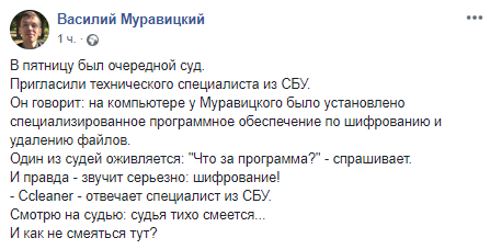 На суде по делу журналиста Василия Муравицкого, которого обвиняют в госизмене, технический специалист СБУ заявил, что на компьютере подсудимого было установлено специализированное программное обеспечение по шифрованию и удалению файлов. Когда же судья поинтересовался названием программы, то специалист заявил: "Ccleaner". У судьи этот ответ вызвал улыбку, поскольку эта программа Ccleaner - популярная бесплатная программа для очистки компьютера.