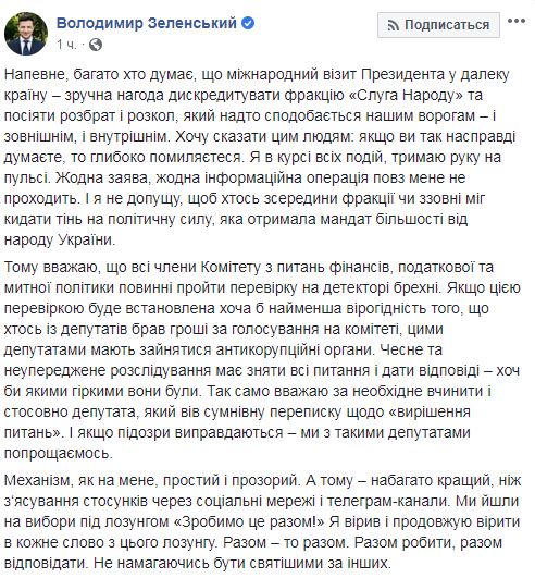 Президент Владимир Зеленский считает, что все члены комитета Верховной Рады по вопросам финансов должны пройти проверку на детекторе лжи в связи со скандалом с возможным получением взяток "слугами народа". Об этом сказано в сообщении Зеленского в его Facebook.