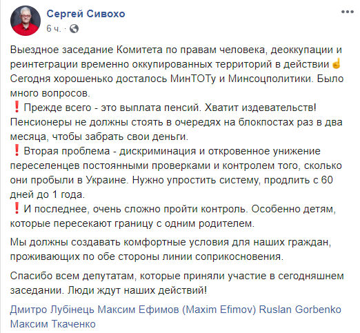 "Выездное заседание Комитета по правам человека, деоккупации и реинтеграции временно оккупированных территорий в действии. Сегодня хорошенько досталось МинТОТу и Минсоцполитики. Было много вопросов. Прежде всего - это выплата пенсий. Хватит издевательств! Пенсионеры не должны стоять в очередях на блокпостах раз в два месяца, чтобы забрать свои деньги", - написал он.