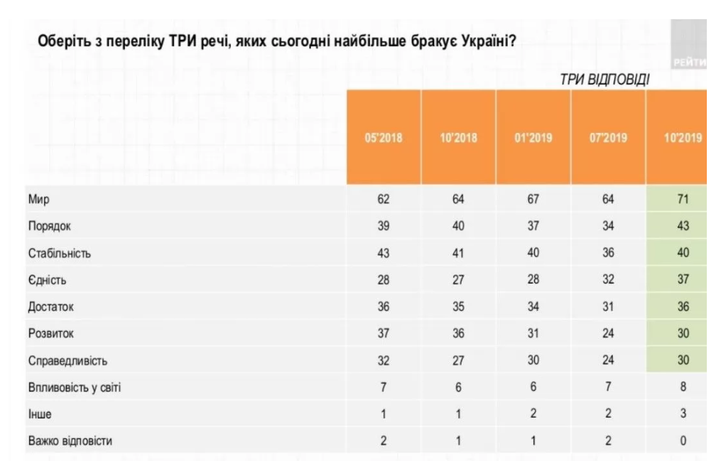 "71% отметили, что сегодня Украине больше всего не хватает мира. 43% - считают, что Украине нужен порядок, 40% - стабильность, 37% - единство, 36% - достаток, по 30% - развитие и справедливость, 8% - влиятельность в мире. Запрос на все перечисленные категории за последние три месяца вырос, больше всего - в отношении мира и порядка", - говорится в тексте опроса, опубликованного в четверг на сайте "Рейтинга".