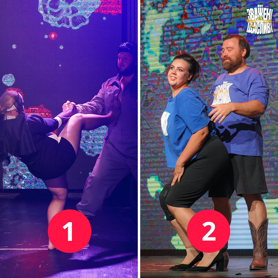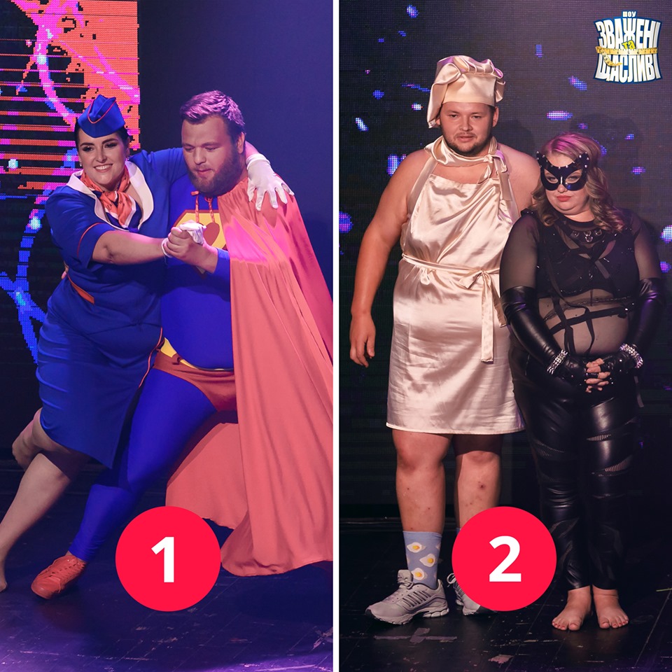 Парам предложили разные уровни подготовки: две из них тренировали Алена Шоптенко и Макс Ежов, известные по "Танцам со звездами", двое готовились по видеоурокам, одна пара - по аудиоурокам. Все зависело от того, какую цену участники готовы были предложить на аукционе. На кону были килограммы. Во время выхода на паркет остальные команды наблюдали из зала, сидя на тренажерах, где нужно было удерживать вес ногами. Как только кто-то из них отпускал груз - на сцене гасла одна из секций света. Чем больше вес, тем больше риск, что судьи просто не рассмотрят номер, поскольку танцевать придется в темноте.