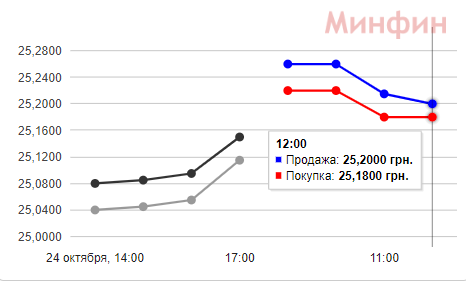 25 октября регулятор установил официальный курс доллара на уровне 25,11 грн, - на 22 копейки выше в сравнении с предыдущим банковским днем. В обменках доллар в обед торгуется в рамках 24,95 грн - покупка и 25,04 - продажа. Межбанк показывает рост курса валюты на 5-6 копеек: покупка - 25,18 грн, продажа - 25,20 грн. В банках средняя покупка достигла пределов: 24,9 в покупке и 25,22 грн в продаже.