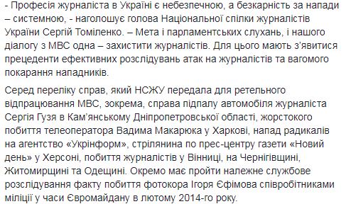 "Профессия журналиста в Украине опасна, а безнаказанность за нападения стала системной. Цель и парламентских слушаний, и нашего диалога с МВД одна - защитить журналистов. Для этого должны появиться прецеденты эффективных расследований атак на журналистов и весомого наказания нападавших", - заявил председатель Национального союза журналистов Украины Сергей Томиленко.