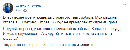 "Вчера возле моего подъезда сгорел этот автомобиль. Моя машина стояла в 10 метрах. Сгоревший бус не принадлежит жильцам дома. С одной стороны, учитывая криминальные войны в Харькове - ерунда. И может случайность. А с другой, может кто-то что-то хочет мне сказать? Тогда отвечаю, я решение принял и оно не изменится..." - написал Алексей Кучер.