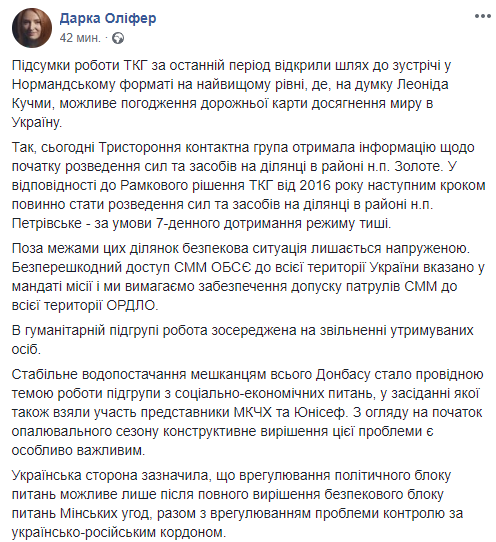17:00 Пресс-секретарь представителя Украины в ТКГ Кучмы Дарья Олифер по итогам заседания ТКГ в Минске также сообщила, что после разведения сил в Золотом (Луганская обл.) следующим шагом должно стать разведение сил и средств на участке вблизи Петровского (Донецкая обл.). При условии 7-дневной тишины.