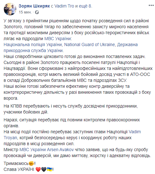 17:40 Советник министра внутренних дел Зорян Шкиряк сообщил, что в районе Золотого работают усиленные патрули Нацполиции и Нацгвардии. "Ситуация находится под полным контролем правоохранительных органов. На месте происшествия постоянно находится заместитель главы Нацполиции Вадим Троян" - сообщил Шкиряк.