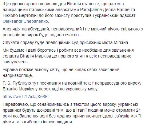 Еще одной хорошей новостью для Виталия, как отметил заместитель министра, стало то, что к команде защиты присоединился украинский адвокат Александр Чебаненко. "Апелляция на абсурдный, неправосудный и не имеющий ничего общего с реальностью приговор будет подана вовремя. Слушать дело будет апелляционный суд присяжных города Милана", - добавил Геращенко.