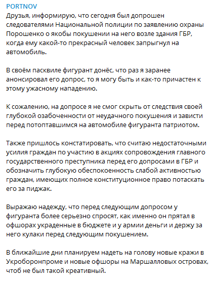 "К сожалению, на допросе я не смог скрыть от следствия своей глубокой озабоченности от неудачного покушения и зависти перед потоптавшимся на автомобиле фигуранта патриотом. Также пришлось констатировать, что считаю недостаточными усилия граждан по участию в акциях сопровождения главного государственного преступника перед его допросами в ГБР и обозначить глубокую обеспокоенность слабой активностью граждан, имеющих полное конституционное право потаскать его за пиджак", - написал Портнов.