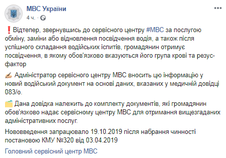 "Администратор сервисного центра МВД будет вносить эту информацию в новый водительский документ на основе данных, указанных в медицинской справке 083/о", - сказано в сообщении.