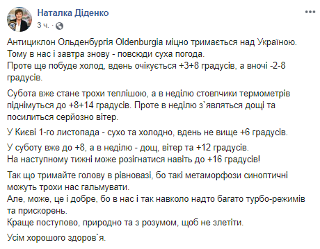 "Антициклон Ольденбургия (Oldenburgia) крепко держится над Украиной. Поэтому у нас и завтра снова - повсюду сухая погода. Однако еще побудет холод, днем ​​ожидается +3...+8 градусов, а ночью -2...-8 градусов", - написала Диденко.