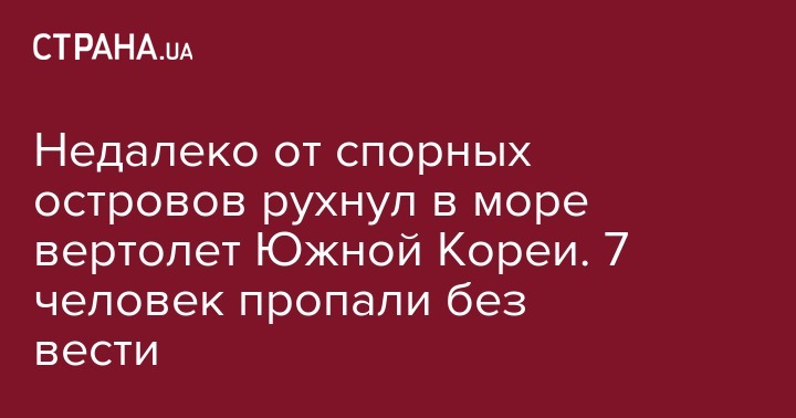 В море, недалеко от спорных с Японией островов Токто, рухнул вертолет Южной Кореи. Семь человек, которые находились на борту, числятся пропавшими без вести. Об этом сообщает Yonhap.