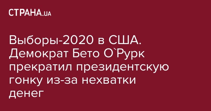 Напомним, что О'Рурк объявил о намерении баллотироваться на пост президента США на выборах-2020 еще в марте 2019 года. В первые 24 часа своей кампании ему удалось собрать $6,1 млн, но затем поддержка стала слабеть. Согласно последним опросам, О'Рурк набирал около 3% голосов избирателей.
