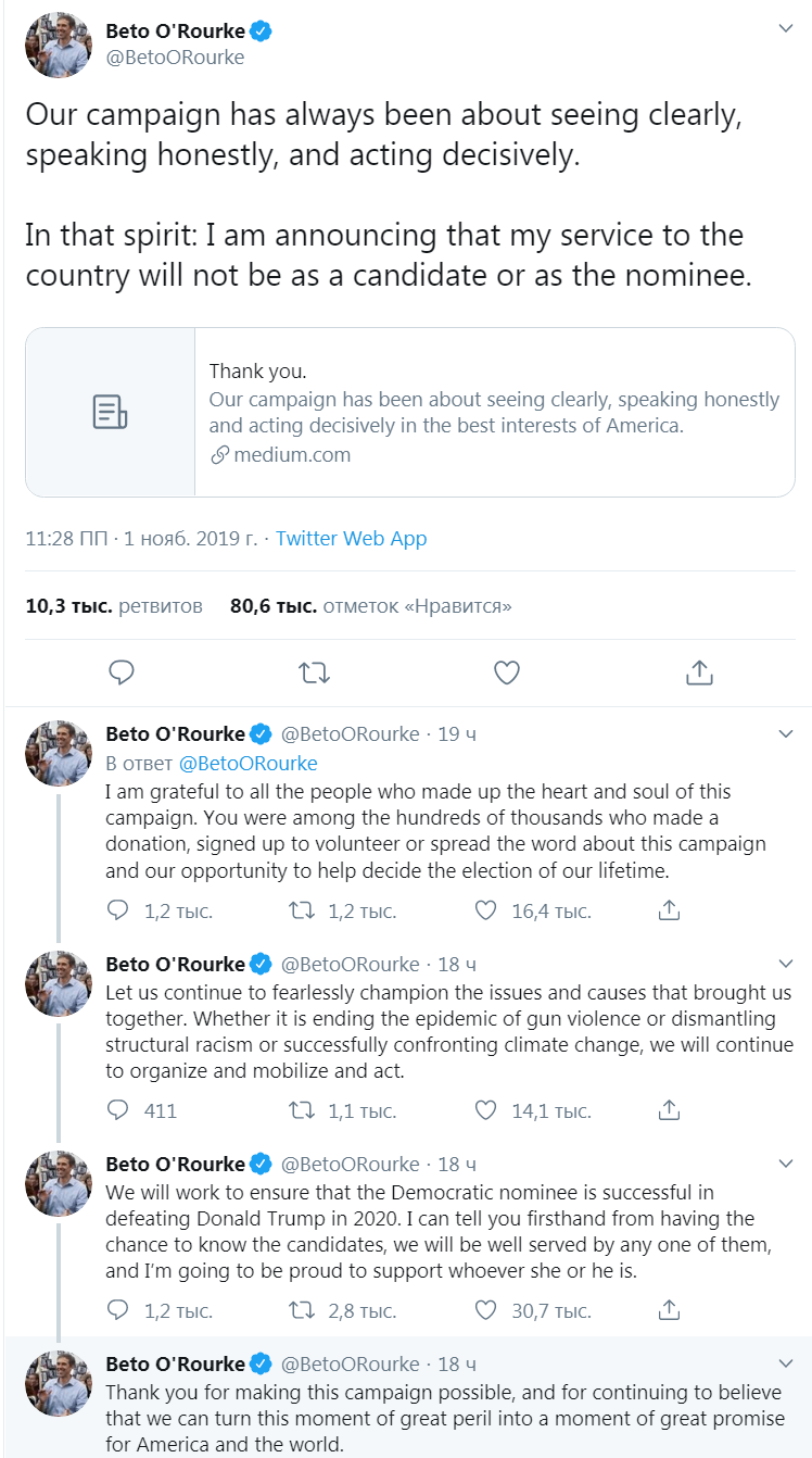 Бывший член Палаты представителей от Демократической партии Бето О'Рурк объявил 1 ноября, что заканчивает свою президентскую кампанию из-за нехватки средств. Об этом он написал в своем Twitter.