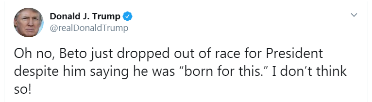 "О нет... Бето только что выбыл из президентской гонки, хотя говорил, что "рожден для этого". Я так не думаю!" - написал президент США в микроблоге.