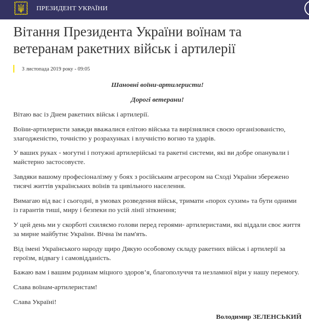 Сегодня, 23 ноября, президент Украины Владимир Зеленский, поздравил воинов и ветеранов ракетных войск и артиллерии с профессиональным праздником. В своем обращении к военным он попросил их держать "порох сухим" и быть гарантами тишины вдоль всей линии столкновения. Поздравление президента размещено на его сайте.