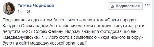 "Поинтересовалась адвокатом Зеленского-депутатом "Слуги народа" Качурой Александром Анатольевичем, который угрожает бросить за решетку депутата ЕС Софию Федыну. Сразу нашла фотодоказательство, что он - "медведчуковское" г ... его фото с символикой "Украинского выбора" было на сайте медведчуковской организации", - написала она в Facebook.