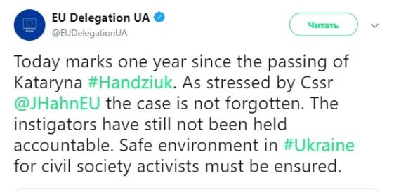 "Сегодня исполняется один год со дня смерти Екатерины Гандзюк. Как подчеркнул комиссар ЕС по вопросам европейской политики соседства и переговоров о расширении Йоханнес Хан, дело не забыто. Заказчики до сих пор не привлечены к ответственности. Безопасные условия для активистов гражданского общества должны быть гарантированы в Украине", - говорится в сообщении.