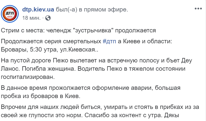 "Бровары, 05:30 , ул.Киевская… На пустой дороге Peugeot вылетает на встречную полосу и бьет Daewoo Lanos. Погибла женщина. Водитель Peugeot в тяжелом состоянии госпитализирован", - говорится в сообщении группы.