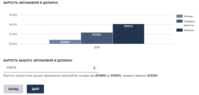 Как видим, калькулятор сам задает оценку автомобиля минимально 12 313 долларов (с учетом уровня цен на рынке, а не технических параметров авто).