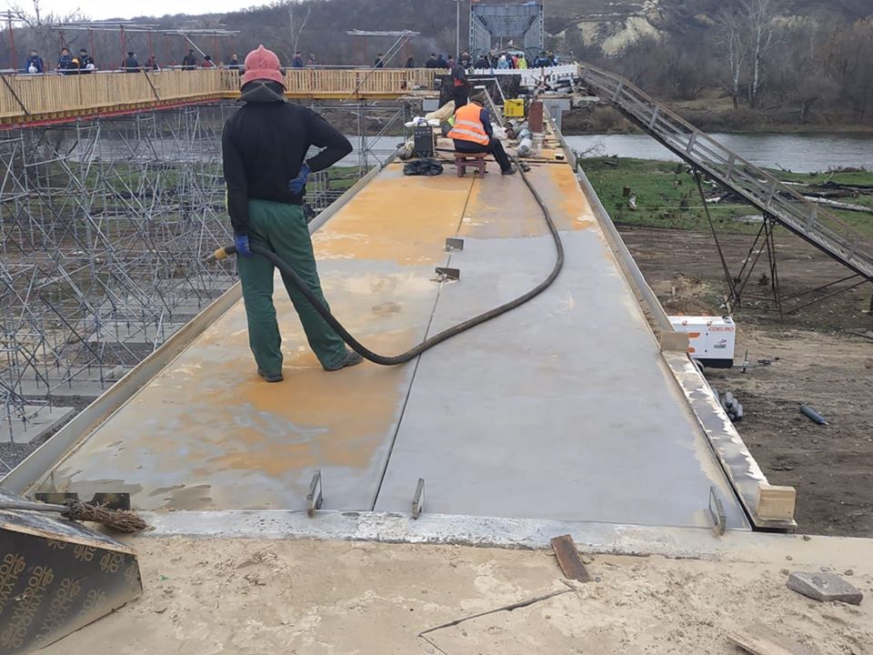 Отмечается, что градостроители завершили укладку металлоконструкций и проводят их сварку. Идет обработка пролетов моста с помощью пескоструйного аппарата. Также проводится разрез железных остатков разрушенного моста.